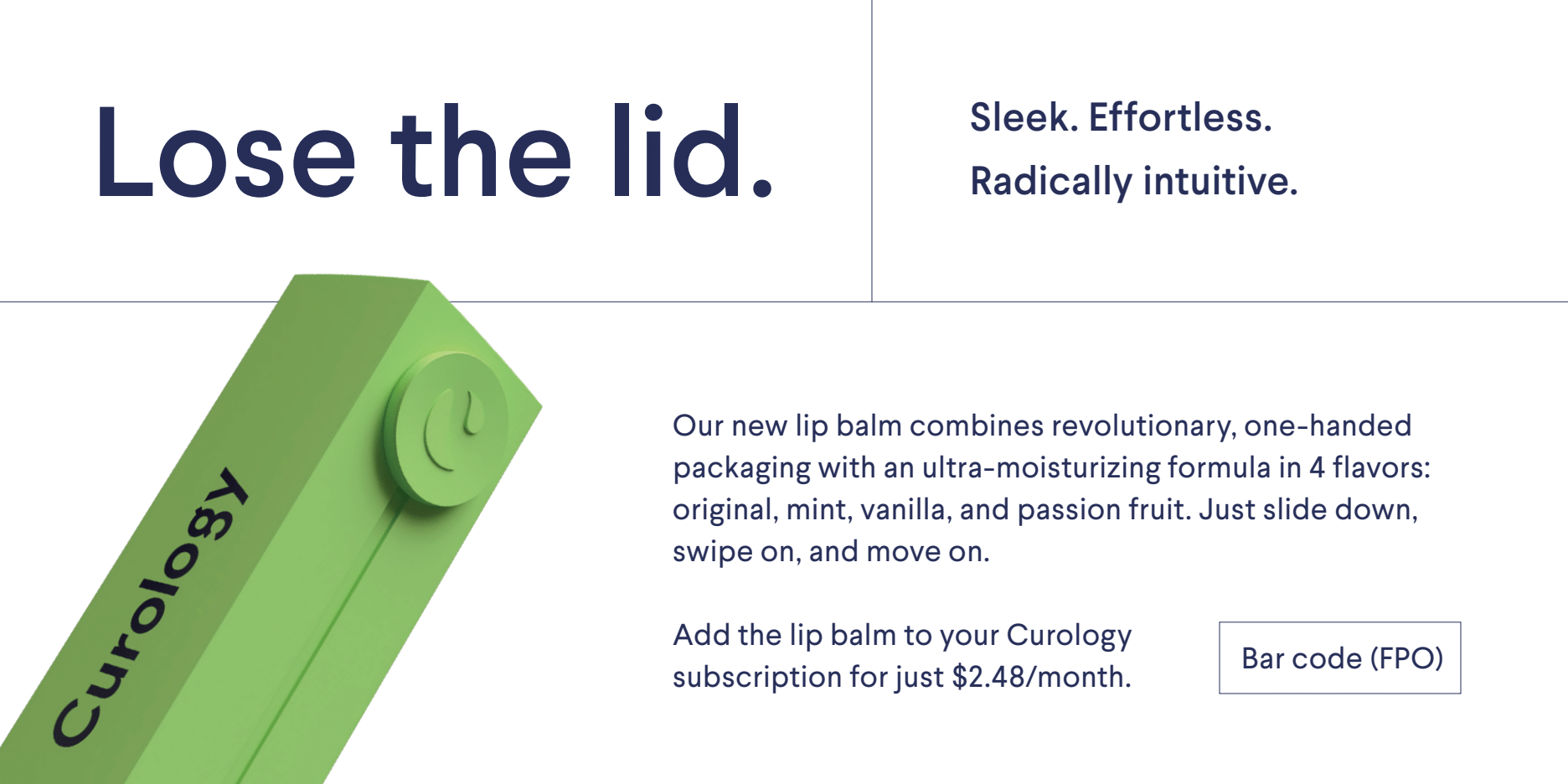 Curology wanted an exorbitant amount of hype around their first “on-the-go” SKU. I worked with an art director/motion graphics designer to create a sexy, cinematic 3D world inspired by a big tech launch. Peppered with a little bit of cheek, of course—it is, after all, a lip balm, not an iPhone.