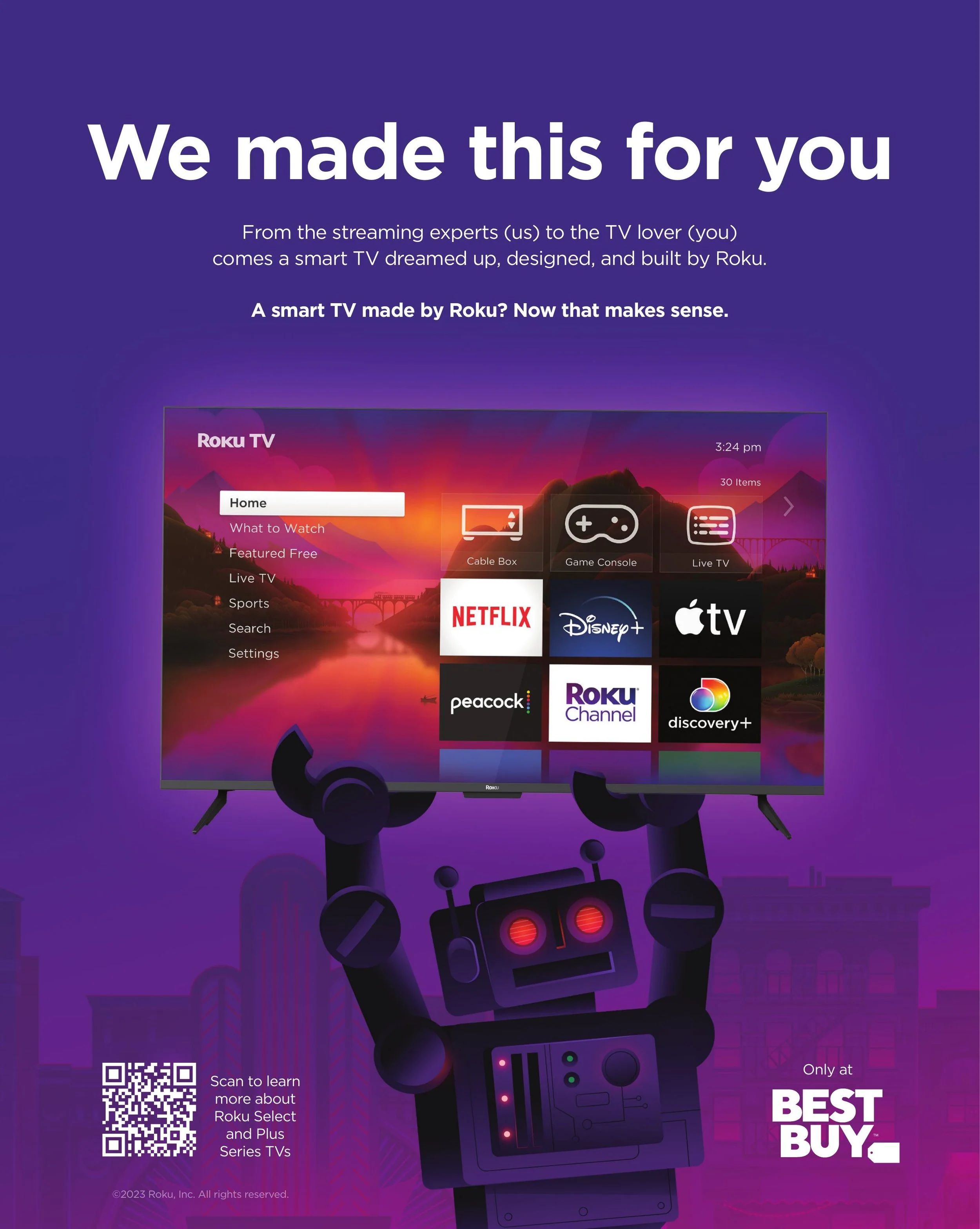 Above is the tagline for Roku’s first ever Roku-branded smart TV—designed, built, and sold by Roku with our delightfully simple OS built right in. To announce the exciting new lineup of TVs, I worked with a team of creatives to bring the beloved Roku City characters to life. I penned an earnest, simple message for our characters to deliver on our behalf: We made this for you.